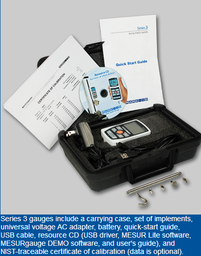 The gauges include MESUR™ Lite data acquisition software. MESUR™ Lite tabulates continuous or single point data. One-click export to Excel allows for further data manipulation.MARK-10先進的3係列數字推拉力計